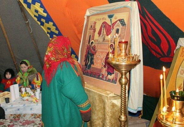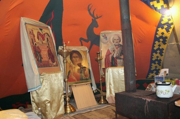 Чум для ненца – это не только жилье, но и культовое сооружение, определяющее и несущее в себе массу обрядов и запретов, регулирующих кочевую жизнь. К примеру, в чуме есть женская и мужская половины, есть место для хранения только мужских или только женских вещей. И при установке икон, подсвечников, столика для свечей и религиозной литературы казаки и настоятель Никольского храма города Тарко-Сале протоиерей Алексей Падылин постарались, при обязательном соблюдении всех православных канонов, максимально учесть обычаи и правила коренных жителей в размещении вещей и походной мебели внутри чума. Например, походный иконостас был размещен на противоположной от входа стороне чума – у ненцев эта часть их традиционного жилища считается священной. Для этого и сам чум был установлен так, чтобы его выход был ориентирован на западную сторону, тогда подставки для икон заняли восточную сторону чума.