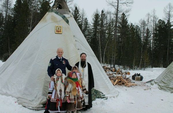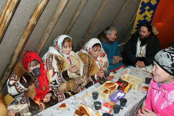 Богослужение в православном чуме началось с водосвятного молебна, и к его окончанию в чум зашли первые посетители из числа коренных жителей. Это были две семьи лесных ненцев из стойбища Медвежья гора. Отец Алексий не раз бывал у них на стойбище, и увидев его в церковном облачении, ненцы поспешили к батюшке на встречу.
