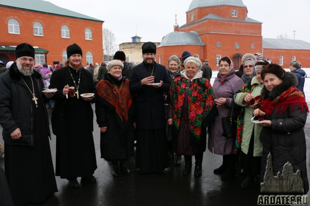 После воскресной литургии епископ Вениамин вместе с прихожанами храма и всеми желающими принял участие в торжественной трапезе на соборной площади. Традиционных масленичных угощений было очень много, сытыми остались все. В общей сложности было съедено около тысячи блинов. Стараниями сотрудников МЧС была организована горячая полевая кухня.