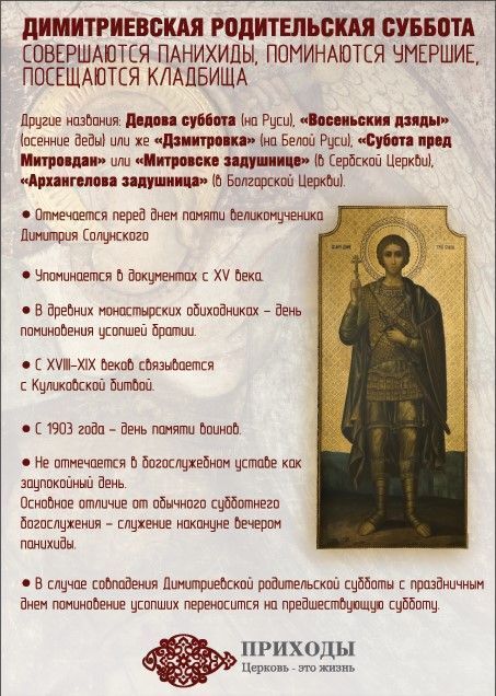 Димитриевская родительская суббота приходится на субботний день перед днем памяти великомученика Димитрия Солунского