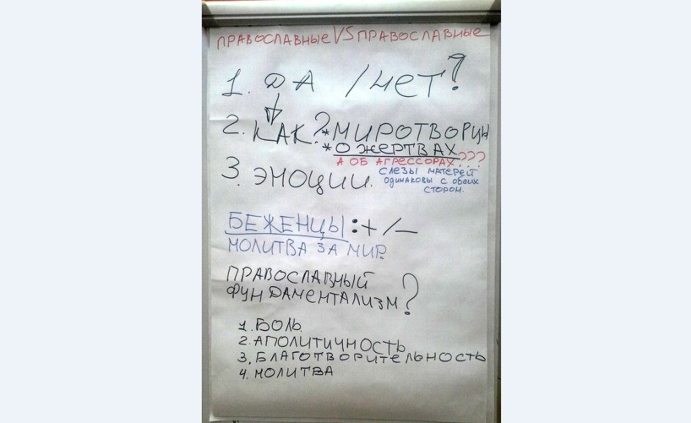 Шестьдесят человек − православные журналисты и священнослужители из России и Украины высказали свои мнения: какое место должна занимать тема войны на Юго-Востоке Украины в церковных СМИ, какими методами должны пользоваться православные журналисты при описании боевых действий, и нужно ли вообще об этом писать?