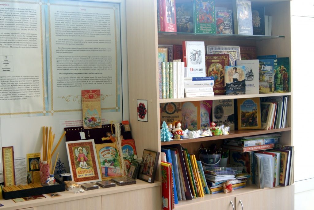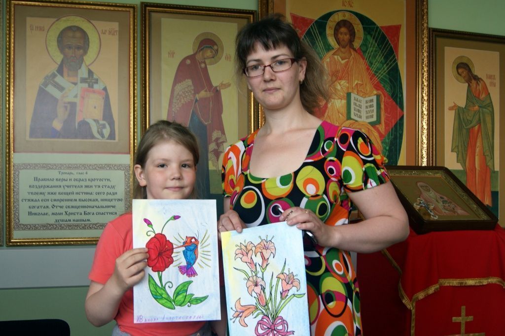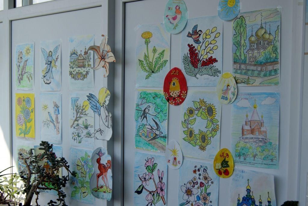 Конечно, когда мы зашли внутрь, то увидели и большие иконы, висящие на стенах, и подсвечники рядом с ними, но помещение от этого не было мрачным или же чересчур аскетично-молитвенным. Напротив, яркое летнее солнце своими лучами высвечивало не только лики и образа, но и детские поделки из ватных дисков, лежащие на столах рядом с огромным количеством рисунков (которые, видимо, не вместились на стены). Привлекла взгляд и небольшая, но основательно организованная библиотека, расположившаяся неподалеку от большого телевизора на стойке. «Простите, а это для демонстрации православных фильмов?», – поинтересовались мы уже у знакомой нам Ларисы Анатольевны. Женщина улыбнулась и показала нам на диски и «флэшки» с мультфильмами, лежащие стопочкой на одной из полок «библиотеки». Это были обычные советские и российские произведения наших мультипликаторов, которые многие из нас помнят и любят до сих пор.
