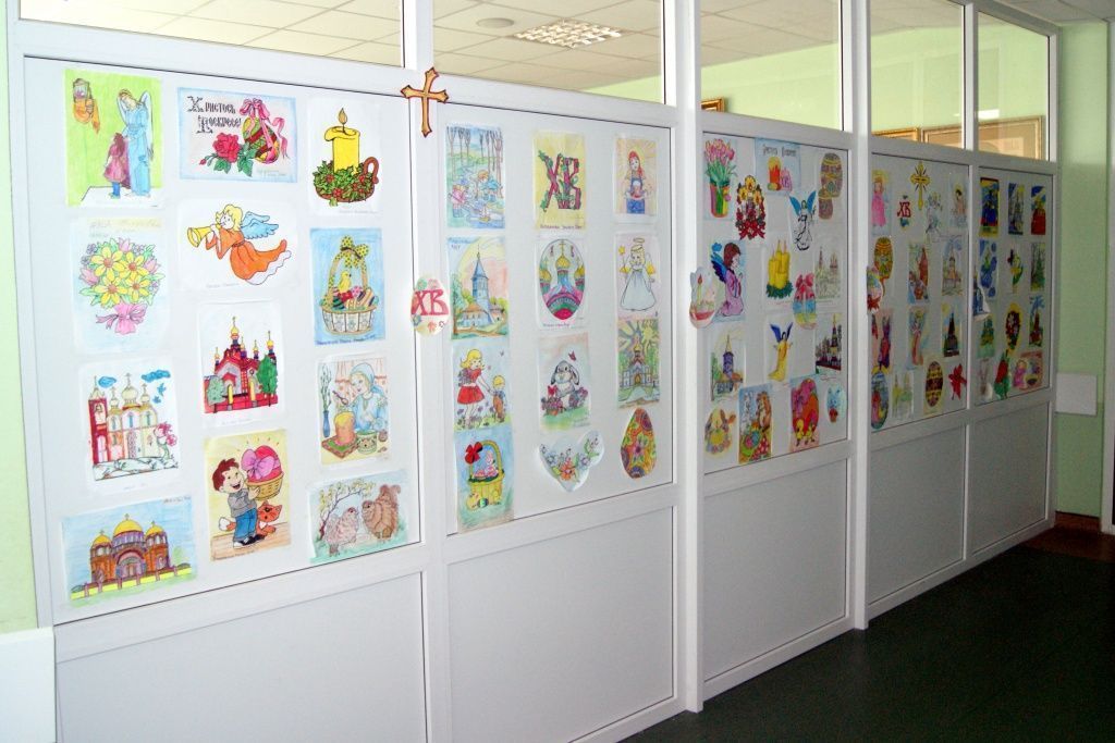 Благодаря радушию охраны мы довольно быстро узнали о местоположении часовни. Поднявшись на нужный нам этаж, мы не увидели огромных черных крестов на стенах и надписей «православие или смерть», и это несказанно обрадовало. А если говорить серьезно, то перед нами вдруг очутилась целая стена из детских рисунков, посвященных празднику Пасхи. Такое первое знакомство уже вселило надежду на то, что опасения некоторых людей насчет «клерикального влияния» не имеют под собой основания.