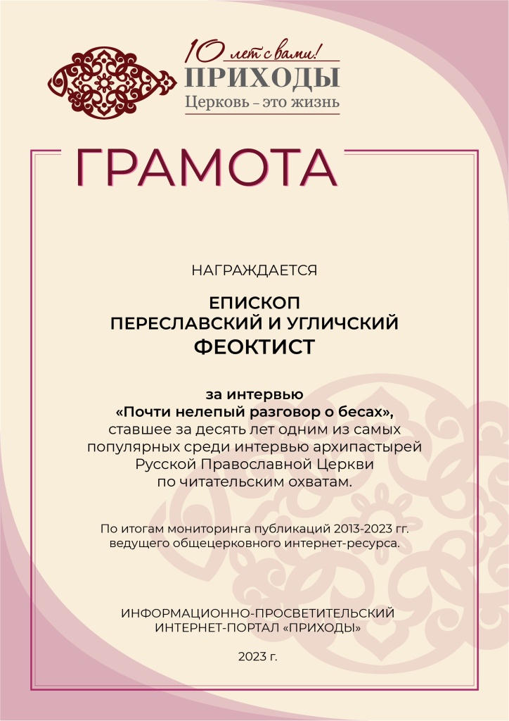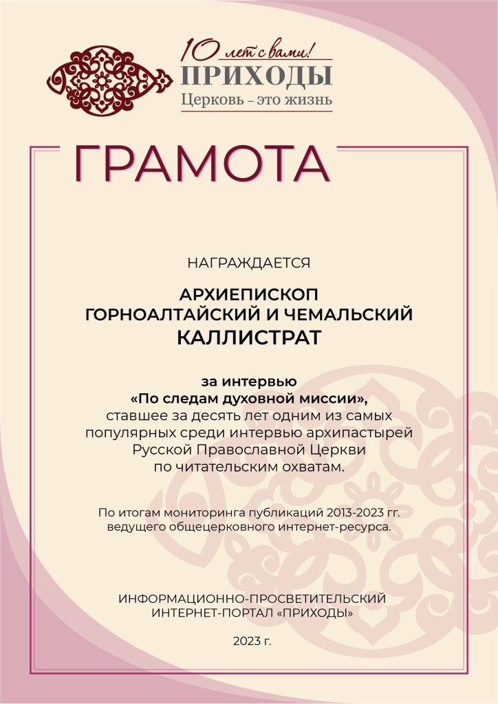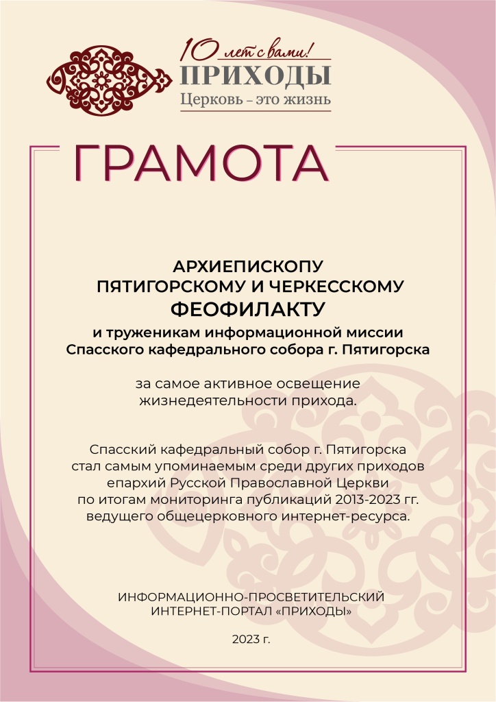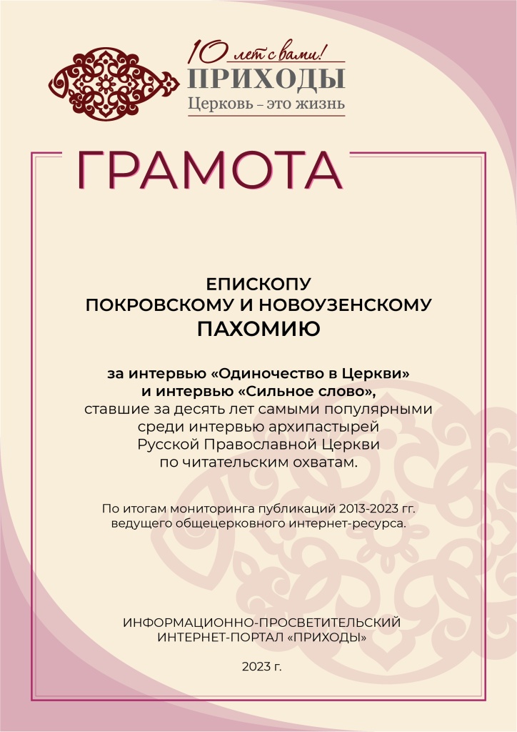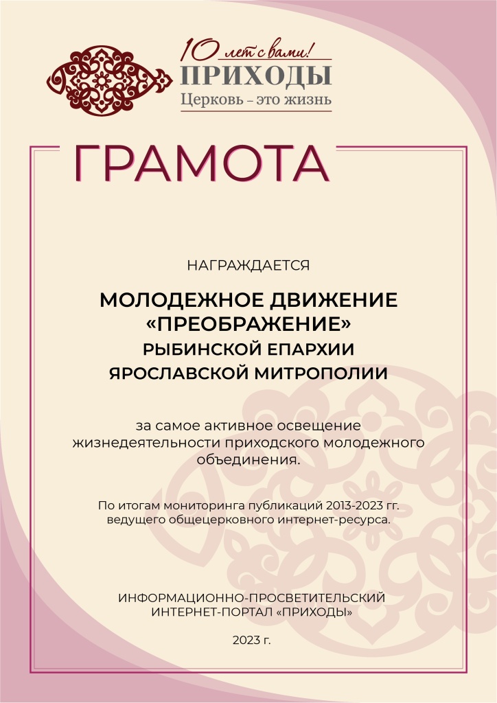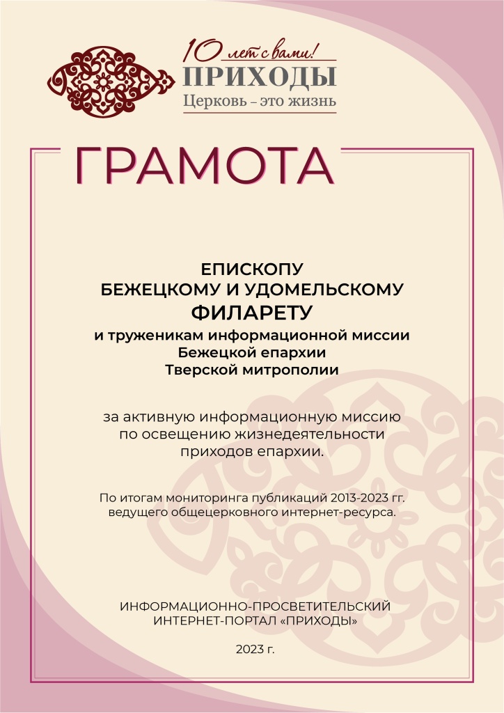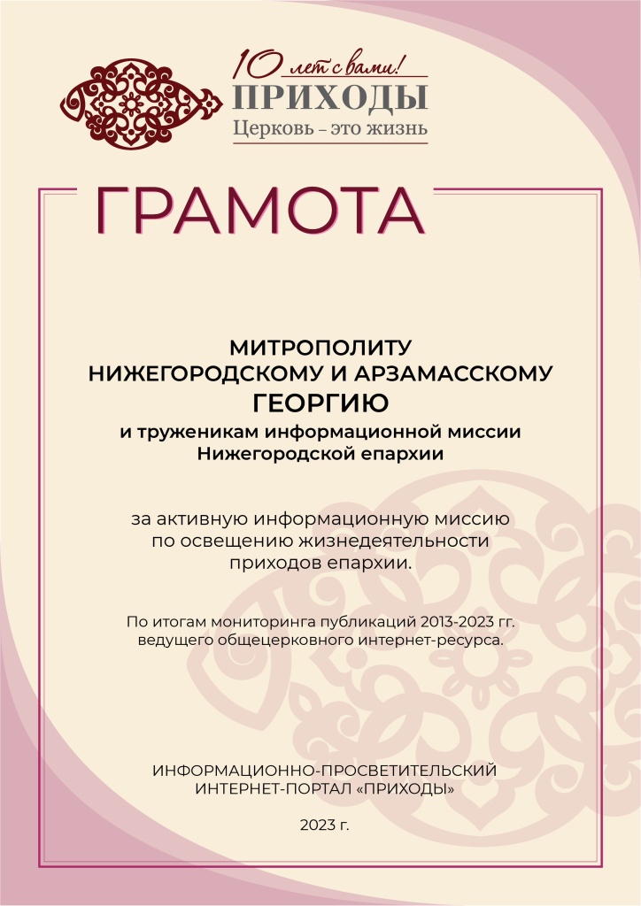 В наш праздник мы хотим отметить самых активных в информационном плане архиереев и возглавляемые ими епархии, а также священников, приходы, православные молодежные объединения. А еще рассказать о тех, чьи интервью вызвали самый большой отклик со стороны читателей. По итогам мониторинга публикаций ведущего общецерковного интернет-ресурса – портала «Приходы» – было принято решение присудить ряд грамот за самую активную информационную миссию.