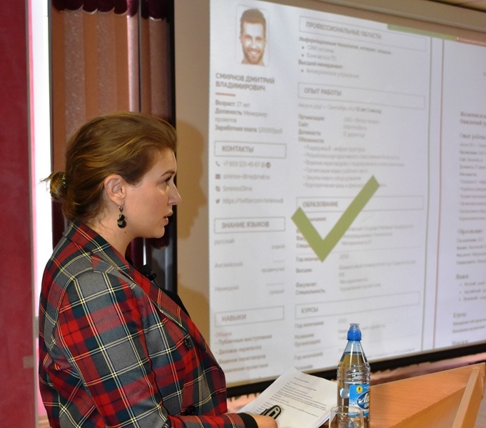 Он начался с мастер-класса бизнес-тренера, психолога и специалиста по трудовым отношениям Татьяны Таку. В ходе встречи, посвященной теме «Самопрезентация и портфолио», были рассмотрены особенности общения соискателя с потенциальным работодателем, обсуждались потенциально конфликтные ситуации, приводились примеры правильного и неправильного заполнения портфолио.