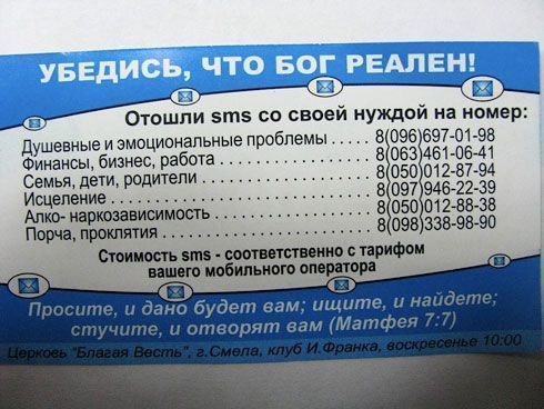 Итак, продолжение истории. Сижу я как-то вечером, никого не трогаю, и вдруг приходит мне смс. Цитирую: «Отче наш! Пройди через мой дом и забери все мои переживания и болезни! Пожалуйста, оберегай мою семью! Во имя Отца и Сына и Святого Духа! Господи, люблю Тебя, нуждаюсь в Тебе, войди в мое сердце, аминь! P.S. Очень сильная молитва. Отправь ее десяти друзьям, включая меня. Отнесись к этому серьезно и увидишь, что произойдет через минуту. Не веришь? Засеки!»