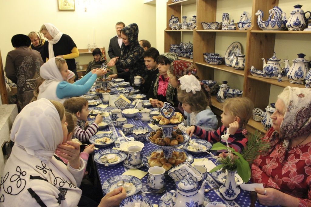 Осенью 2013 года в нашей обители открылась воскресная школа для детей и взрослых. Занятия начинаются с совместного чаепития после Божественной литургии. Пироги, блины пекут на месте, иногда угощения приносят с собой прихожане. Причем, и это нельзя не отметить, чаепитие проходит в очень красиво убранном помещении, уставленном старинными самоварами, с украшенной гжельской росписью посудой на полках, с занавесками в русском стиле на окнах, с настоящей печкой, увешанной вязанками трав и заплетенным в косы луком.