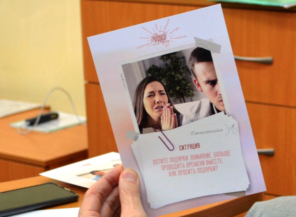 Специально для лектория командой АНО «Делай Благо» были подготовлены красочно оформленные карточки, с помощью которых присутствовавшие могли закрепить в памяти услышанную информацию.