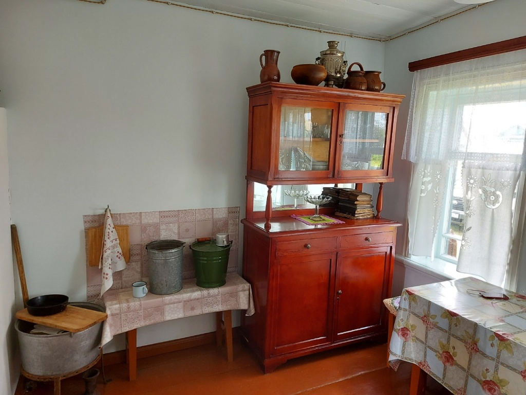 На первый взгляд, время в небольшом деревянном домике остановилось. Внутри обстановка из 50-х: русская печка, иконы на стенах, прялка с веретеном, посуда в буфете, старинный сундук и аккуратно заправленные кровати с оборками. Много хлопот связано с восстановлением дивана. Необычный предмет интерьера встречается на многих семейных фотографиях. Его точную копию смастерили из двух «мебельных родственников». Затем диван обшили тканью, рисунок которой повторяет тот, что был в середине прошлого века.