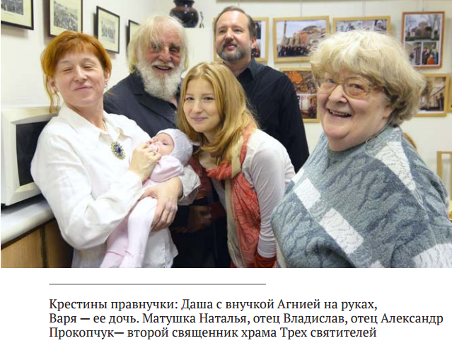 − Ничего. А откуда я могла, если я не видела ни одного священника − отца Владимира Воробьева (духовного отца мамы) рукоположили позже. Мне перед службой Ира Третьякова (вдова художника, преподавателя ВГИКа Николая Третьякова) сказала: «Услышишь «Отче наш», проходи вперед, через 15 минут будет причастие». А я и знала только «Отче наш», даже Символ веры не знала. Поговорить со священником было невозможно, сразу стало бы известно. Во время исповеди спросить? Так тогда была только общая исповедь, на нее я с вами и ходила. Батюшка перечисляет грехи и велит повторять: «Воровство». Вы маленькие стоите и повторяете, креститесь: «Грешен». «Аборты», вы снова: «Грешны». Тогда и на Пасху не причащали. Однажды пришла на пасхальную литургию женщина − она на несколько часов отпросилась из больницы причаститься перед тяжелейшей операцией. Она так перед алтарем плакала, умоляла, у амвона преклонилась, чтобы ее причастили. Нет, и все.