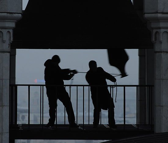 В Пасхальную ночь 26 апреля 1992 года Святейший Патриарх Московский и всея Руси Алексий II служил в Богоявленском Елоховском соборе. Мы находились на колокольне в Кремле, а внизу стоял автобус с телевизионщиками. В Кремль транслировали богослужение из Елоховского, а туда, в свою очередь, − то, что происходило на колокольне Ивана Великого. Когда наступило время крестного хода, мы начали звонить благовест, далее звон подхватил большой колокол Богоявленского собора, а выход крестного хода сопровождал совместный звон двух колоколен.