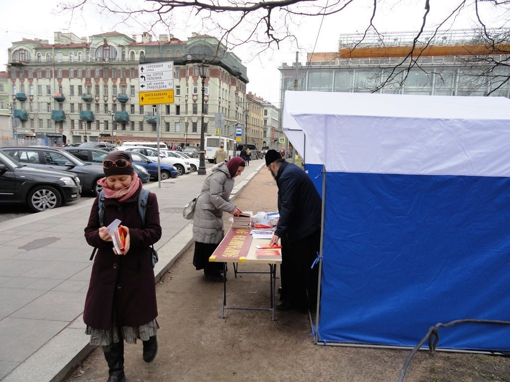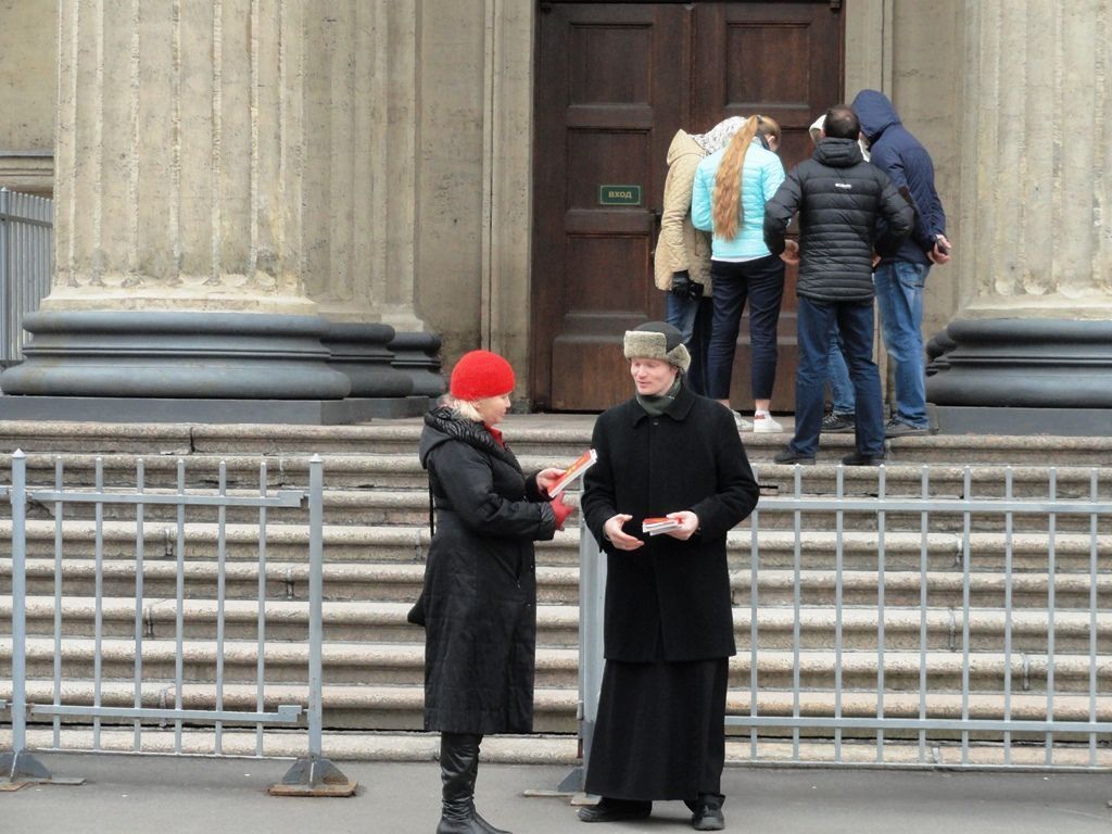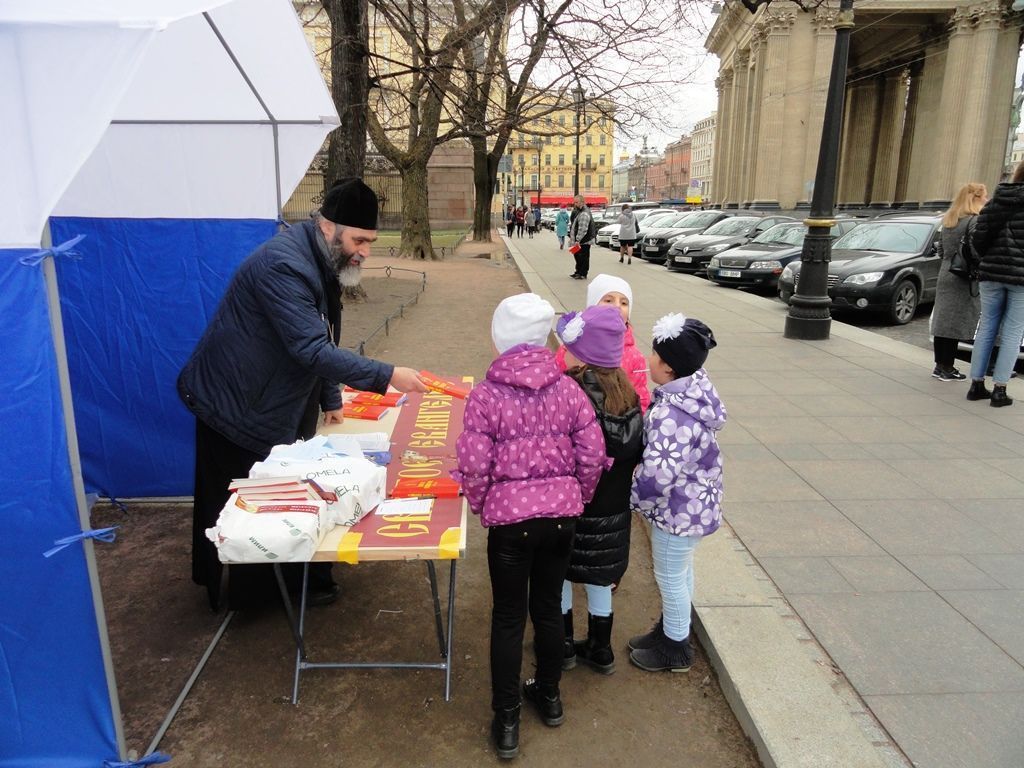 Сейчас я служу алтарником в храме в честь иконы Божьей Матери «Утоли моя печали» при Военно-медицинской академии, где настоятель – отец Георгий Иоффе. Отец Георгий – председатель миссионерского отдела нашей епархии. Я предложил ему это дело, он согласился. Мы договорились на 30 апреля с городскими властями, и возле Казанского собора поставили палатку с книгами. Еще мы сделали закладку с фрагментами из пасхального слова протопресвитера Александра Шмемана. На этой закладке также указаны наши координаты, чтобы у человека была возможность связаться с нами, если захочет. По опыту, конечно, знаю, что если после раздачи тысячи экземпляров приходит человек пять, то это очень хорошо.