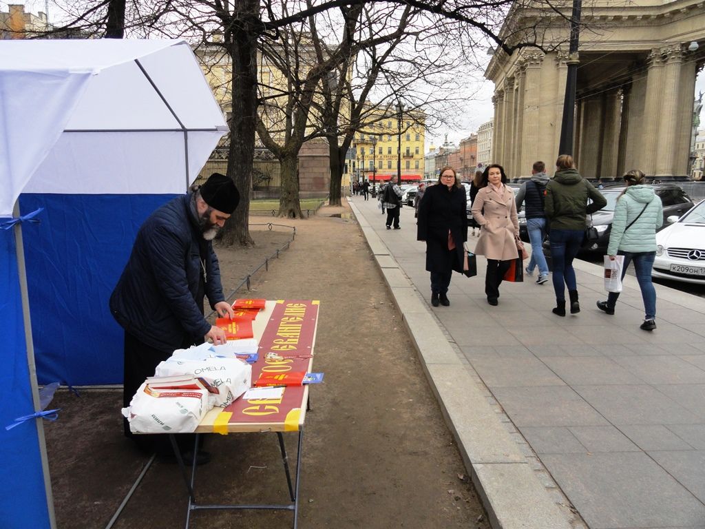 Сколько россиян, считающих себя православными, читали Евангелие? У скольких хотя бы есть дома Священное Писание? Сотрудники миссионерского отдела Санкт-Петербургской епархии не стали гадать, а решили 30 апреля, в день памяти святых жён-мироносиц, просто раздать Евангелие всем желающим. В самом центре города, рядом с Казанским собором, была поставлена палатка с прилавком, на котором лежали книги. За прилавком стоял сам председатель миссионерского отдела протоиерей Георгий Иоффе, двое его помощников прогуливались с книгами поблизости, по тротуарам Казанской улицы. О том, как восприняли акцию прохожие, рассказывает один из организаторов акции «Святое Евангелие в каждый дом», президент благотворительного Фонда имени святой Иулиании Лазаревской Константин Кириченко.