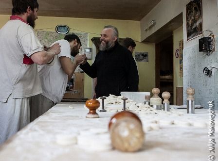 Первый замес теста ставится с восходящим солнцем, а зимой – задолго до рассвета. Тесто состоит из муки, воды и соли, и – Крещенской воды. Конечно же, весь процесс сопровождается молитвой. В монастыре на просфорне трудятся в основном не монахи, а прихожане и батюшки с других храмов. Это отдельная серьезная и тяжелая работа. После замеса тесто ставится в теплое место до поднятия. Как только оно готово, делается новый замес, а первый раскатывается на большом столе с деревянной столешницей.