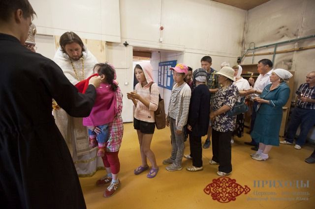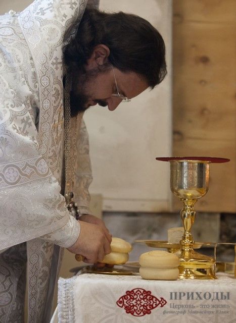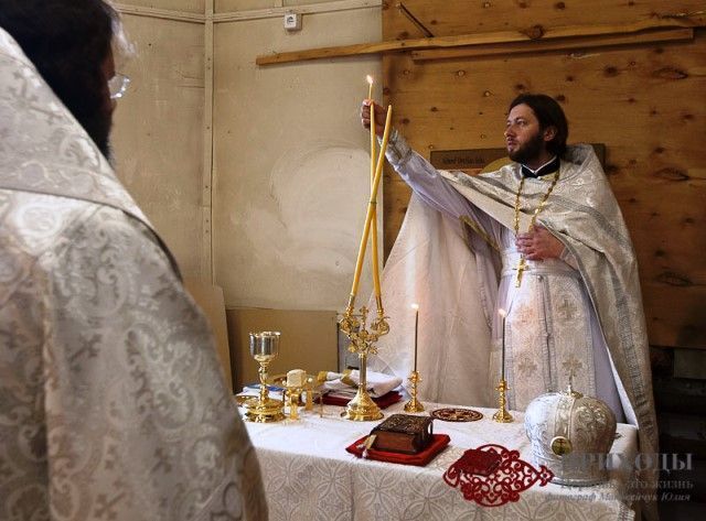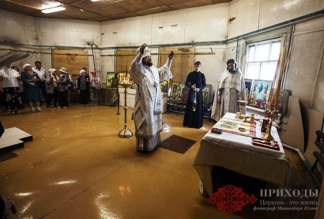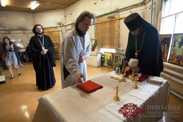Что же, люди пришли молиться, мы, наконец, доехали —  надо служить. Старые канцелярские столы, заботливо покрытые скатертями, были переставлены. На освободившемся месте  устроен алтарь. Впрочем, один из столов переставить оказалось не так-то просто: в центре помещения, как выяснилось, торчал железный штырь, который и послужил четвертой ножкой сломанному предмету мебели. Все-таки удалось соорудить для стола из подручного материала подпорку и переставить в угол, где его приспособили для раздачи запивки. А штырь так и остался.