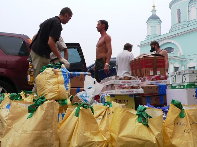 С работы отпустили на две недели без разговоров, продолжая платить зарплату. Батюшка Серафим незримо присутствовал рядом. Любые препятствия легко устранялись, проблемы, большие и маленькие, решались, жизнь устраивалась так, что каждый день с утра я входила в это здание на Николо-Ямской улице. Удивительные люди работали рядом. Город погрузился в плотный смог, в метро уже было страшно спуститься из-за того же дыма, а они до самой ночи в респираторах принимали вещи, сортировали, отправляли…  Все пространство вокруг Синодального отдела было занято гуманитарной помощью: вода, консервы, одежда, лопаты, детские коляски — чего здесь только не было! А люди продолжали и продолжали нести…  Вот передо мной парочка своеобразно выглядящих парней: «Где у вас тут берут в разведчики?» — принесли деньги и просят отправить в деревню, с которой нет связи, чтобы выяснить обстановку. Вот отдает детские вещи мусульманка — «Бог один», а за ней убежденный атеист несет столярные инструменты — «как ваш Бог допустил такое горе». И ничего, не мешает разница взглядов, вероисповеданий и жизненных принципов, главное – все отправлено по назначению и за всех идет молитва.