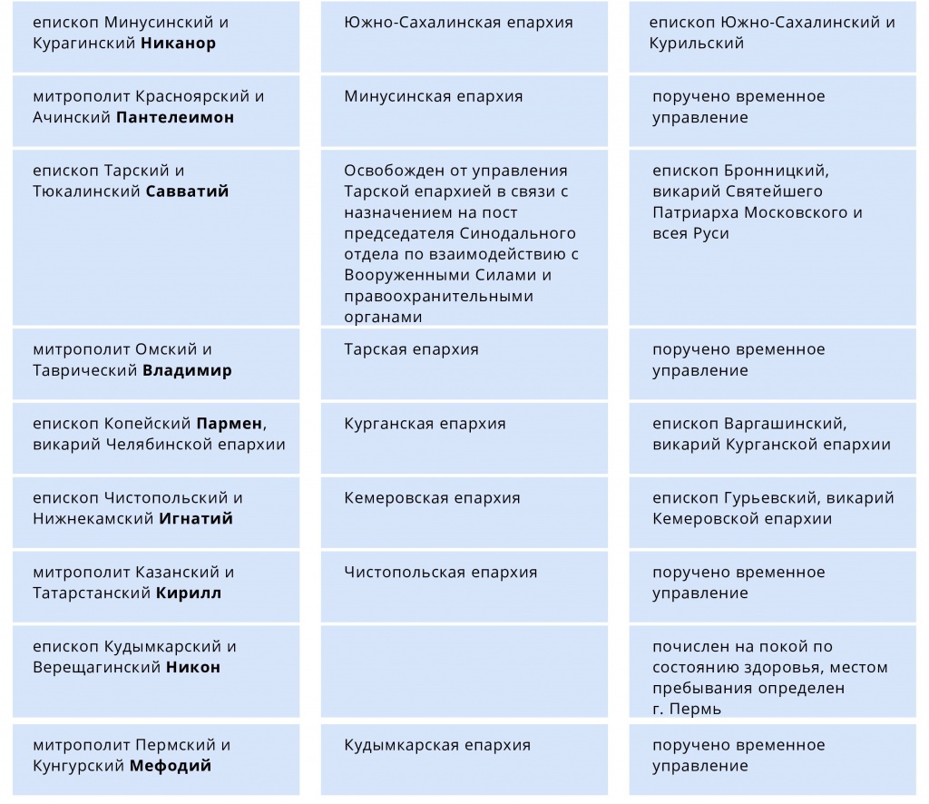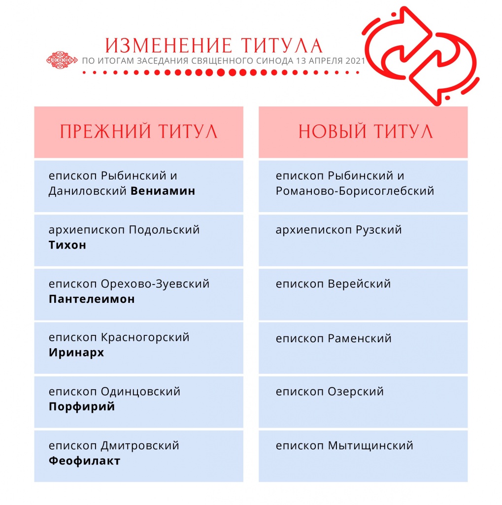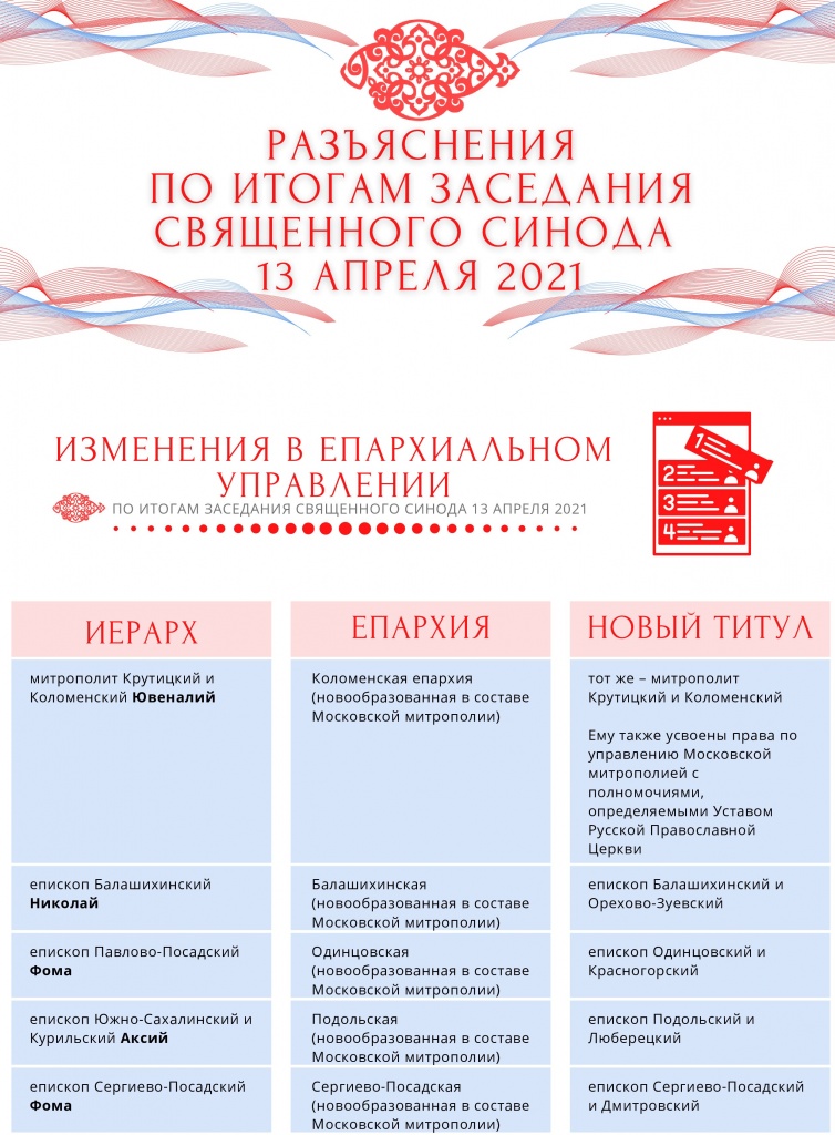 В ходе прошедшего 13 апреля 2021 года в Москве заседания Священного Синода были приняты решения, касающиеся, в частности, назначения архиереев на новые кафедры и внесения уточнений в титулы ряда иерархов, а также изменения границ двух епархий. Для удобства читателей портал «Приходы» изложил содержание соответствующих Журналов Синода в виде таблиц.
