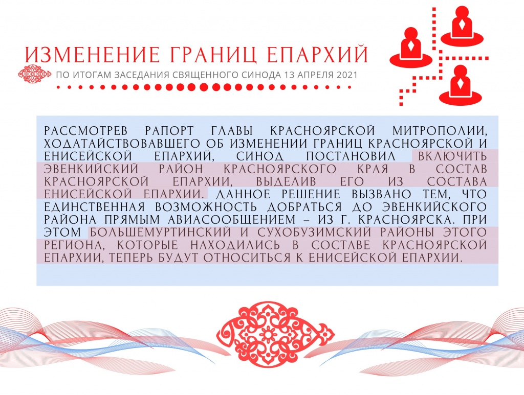 В ходе прошедшего 13 апреля 2021 года в Москве заседания Священного Синода были приняты решения, касающиеся, в частности, назначения архиереев на новые кафедры и внесения уточнений в титулы ряда иерархов, а также изменения границ двух епархий. Для удобства читателей портал «Приходы» изложил содержание соответствующих Журналов Синода в виде таблиц.