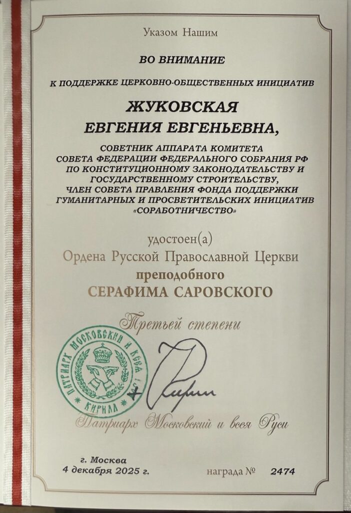 Во внимание к поддержке церковно-общественных инициатив создателю и главному редактору информационно-просветительского интернет-портала «Приходы» Евгении Жуковской вручен орден Русской Православной Церкви преподобного Серафима Саровского (III степени).