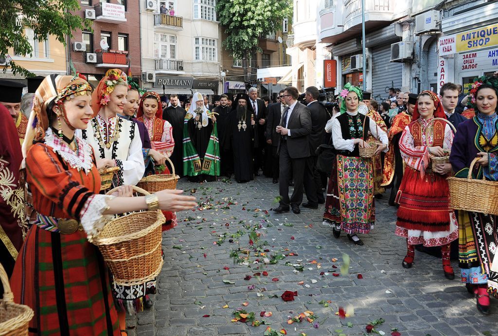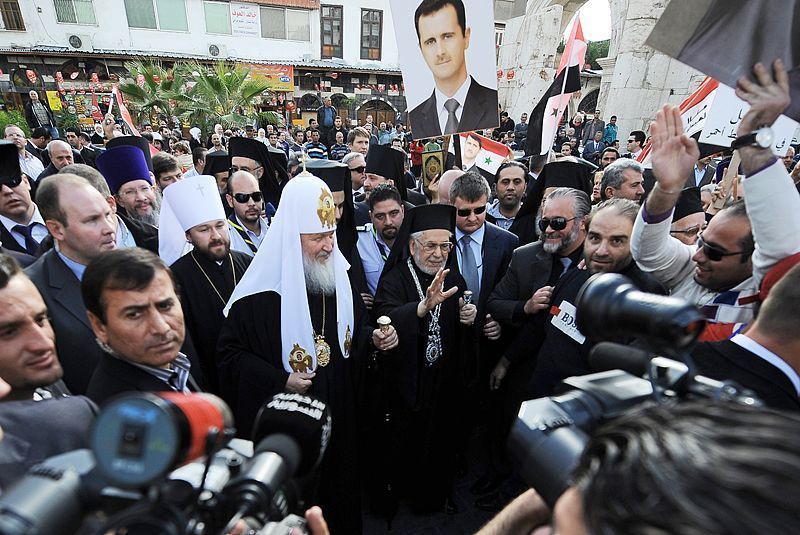 Барабанным боем и приветственными криками Святейшего Патриарха Кирилла встречают перед Успенским собором Дамаска