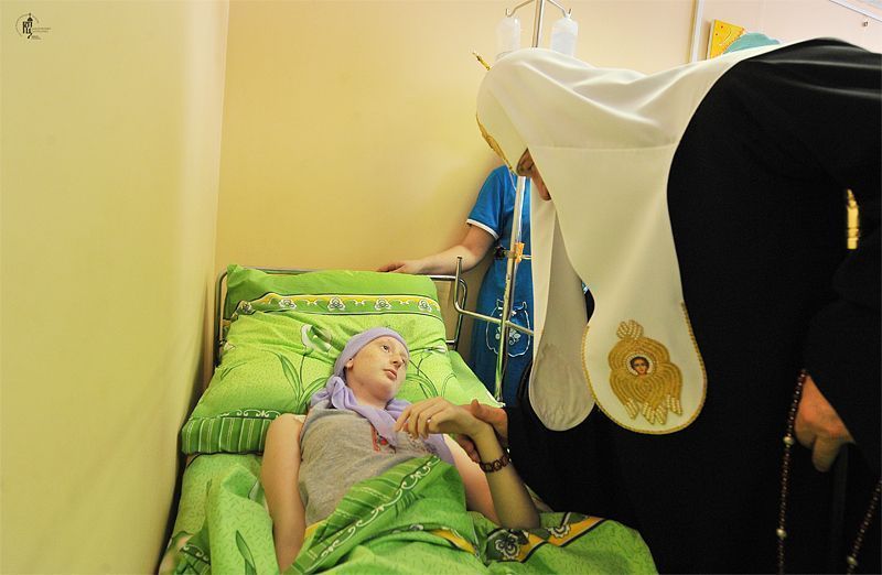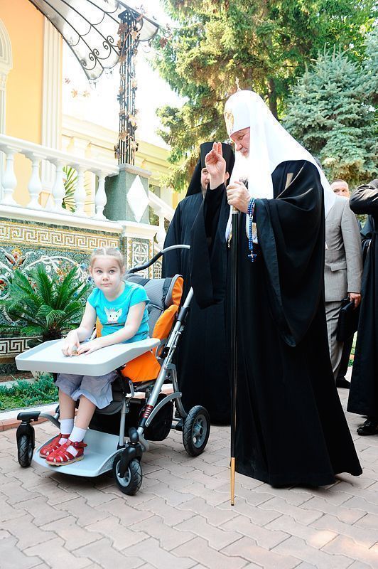 В Успенском монастыре Одессы Святейший Патриарх встретился с пятилетней девочкой Александрой Климовой, страдающей детским церебральным параличом. Святейший Патриарх Кирилл благословил девочку и подарил ей специальную коляску для детей с ограниченными возможностями.