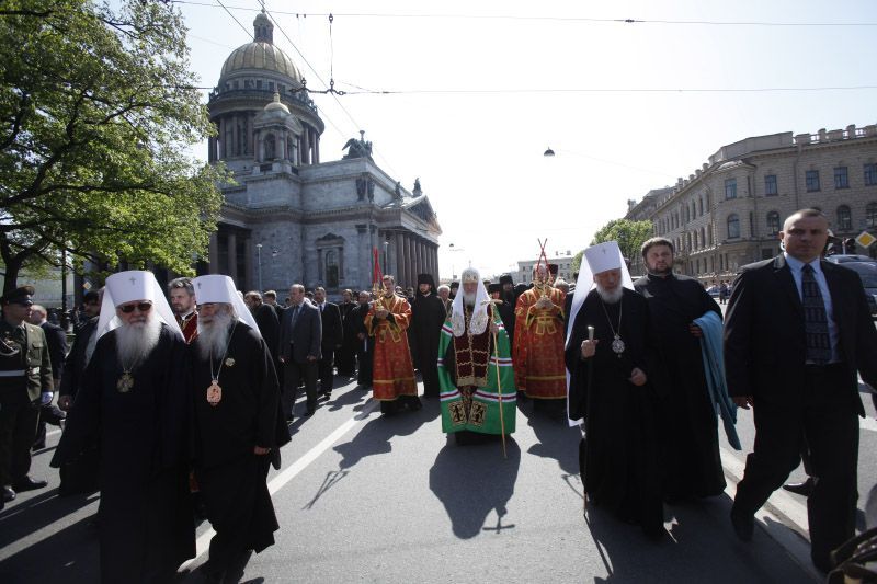 Шествие после литургии в Исаакиевском соборе Санкт-Петербурга к историческому зданию Святейшего Синода, где пройдет первое в современной истории синодальное заседание