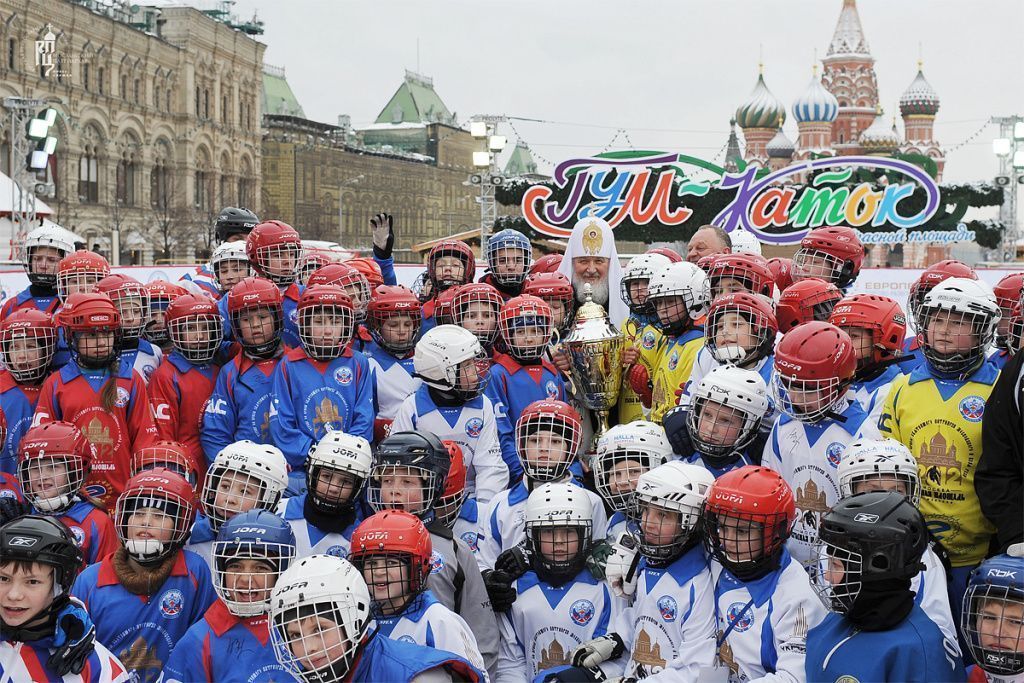 С участниками мини-турнира по хоккею с мячом на призы Святейшего Патриарха Московского и всея Руси