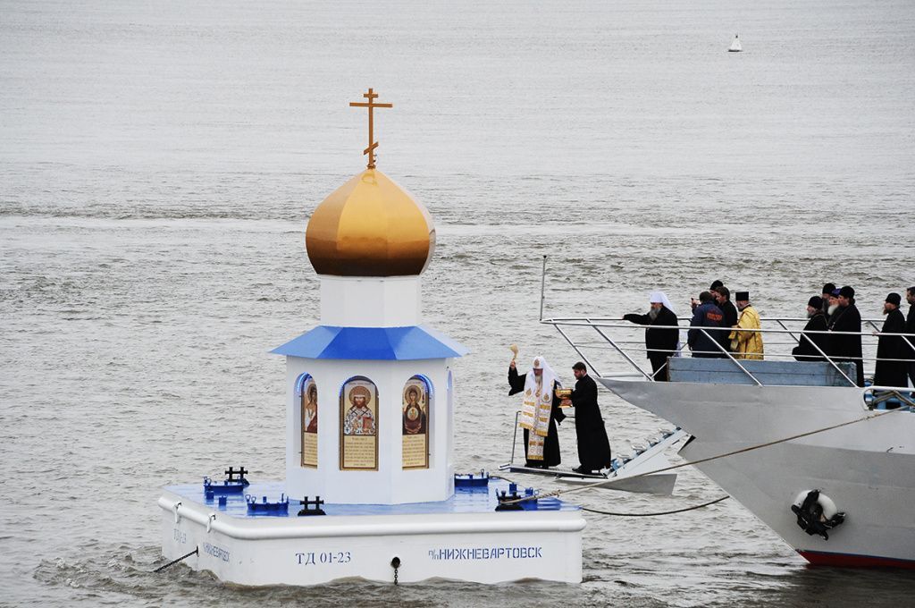 Освящение плавучей часовни-маяка на месте слияния рек Иртыша и Оби в Ханты-Мансийском районе Югры