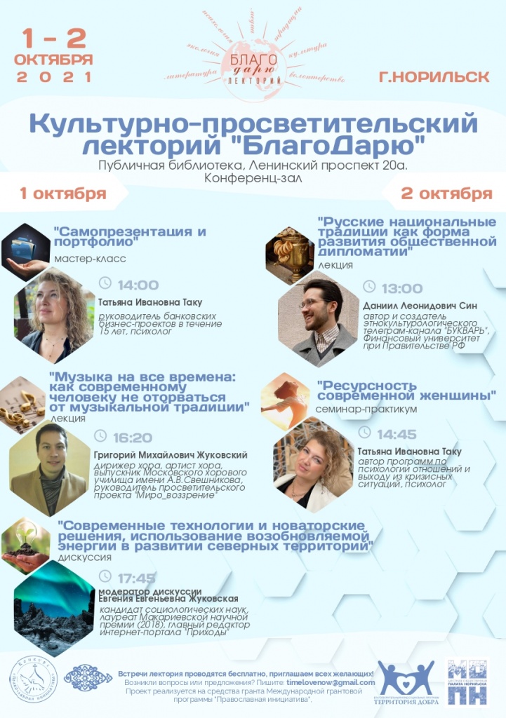 1 и 2 октября 2021 года в г. Норильске Красноярского края состоится лекторий «БлагоДарю». Лейтмотивом серии встреч научных, общественных, культурных деятелей с жителями Норильска станет обсуждение проблем экологии, национальных традиций и психологического здоровья человека. Тем самым просветительский антропологический проект дает возможность слушателям с разных сторон осмыслить жизнь людей в современном мире.