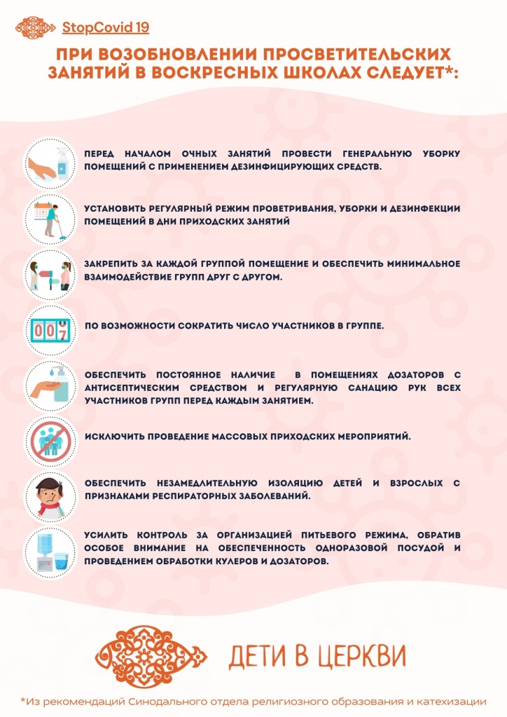Как сообщал портал «Приходы», рекомендации в связи с возобновлением очных приходских занятий в условиях сохранения риска распространения коронавирусной инфекции опубликовал на днях Синодальный отдел религиозного образования и катехизации. Мы подготовили для наших читателей инфографику, которая поможет ознакомиться с этими правилами. Изображение большого разрешения в разных форматах можно скачать по приводимым ниже ссылкам и использовать на вашем приходе.