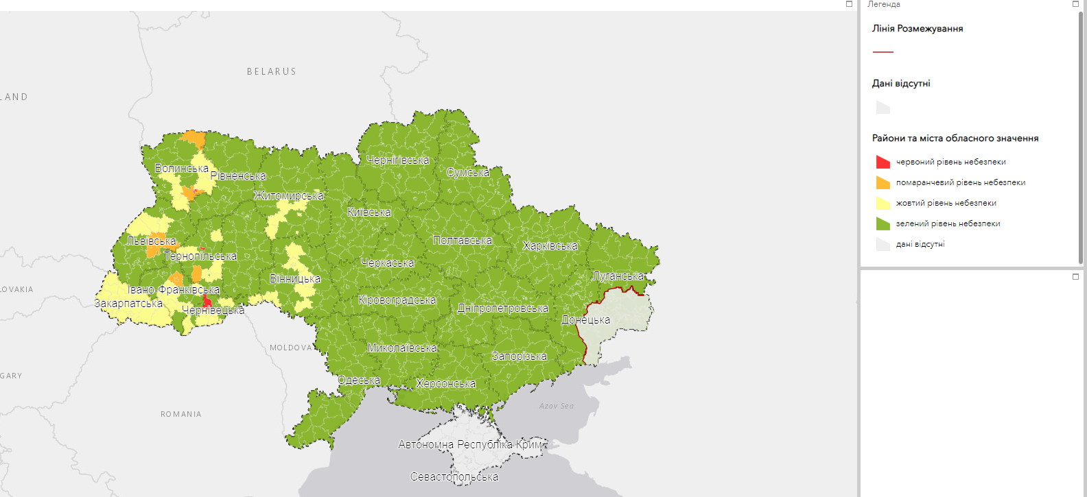 31 июля к красной зоне отнесли западноукраинские города Луцк и Тернополь, а также Кицманский район Черновицкой области. Несколько десятков городов и районов западных областей страны попали в оранжевую и желтую зоны, вся остальная территория, включая Киев, — в зеленую.