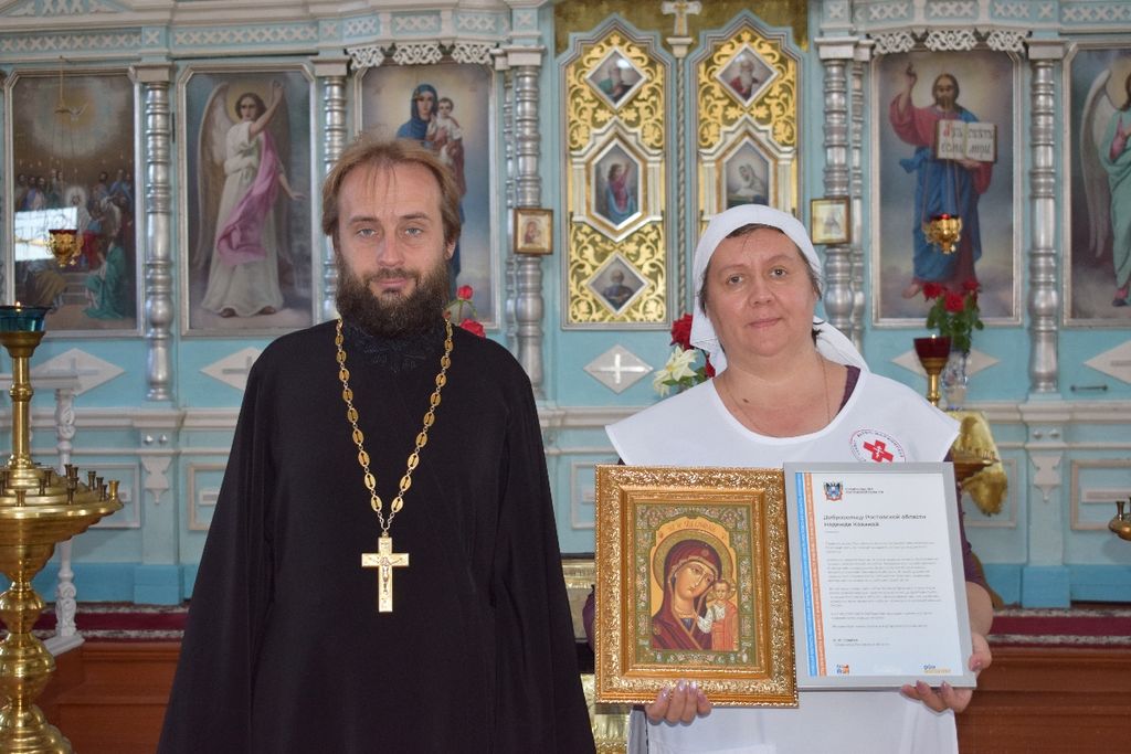 Приходы.ру. 22.09.2020. Старшей сестре Марфо-Мариинского сестричества Надежде Козиной вручили Благодарственное письмо Правительства Ростовской области. Сестры милосердия прихода Архангела Михаила поселка Каменоломни принимали активное участие в общероссийской акции взаимопомощи «#МыВместе», которая проходила с марта по июль.
