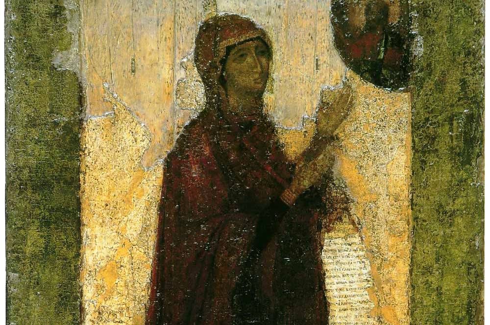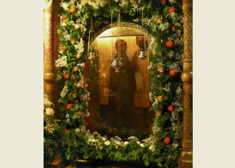 По указаниям князя была создана превосходная, величественная икона уставного византийского письма. Богоматерь изображена на ней во весь рост, с короной на главе и хартией в правой руке. Лик Ея обращен к благословляющему Спасителю, стоящему в облаках. От земли поднимаются очертания храма и монастыря, а у ног Пречистой благоговейно склонился князь Андрей. Левая рука Пресвятой Богородицы поднята к небу, верно, в молитве о нем, о его добрых начинаниях; но вместе с тем Она как бы вверяет этим жестом Божьему водительству всех прибегающих к Ней – и сильных мира сего, и убогих. Суровое величие образа рождает в молящемся чувство благоговейного страха и безответности перед благостью Матери Божией.