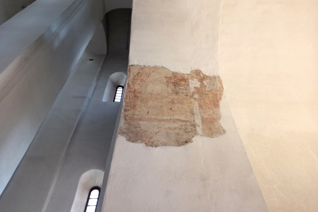 Остатки фресок видны не только возле входа в храм, но и на клиросе – здесь они особенно яркие, и на них можно различить фигуры святых. В нескольких местах возле окон сохранились орнаменты, которыми была украшена церковь. Росписи не поновлялись, говорит настоятель, и они, вероятнее всего, сохранились еще с XII века.