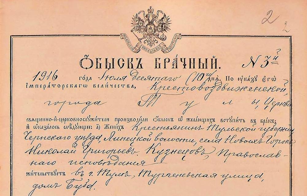 14 февраля в России по завезенной из-за рубежа коммерческо-попсовой традиции празднуют «День всех влюбленных». Розовые сердечки, цветы и тортики – а что дальше? Век назад и ранее влюбленные пары точно знали ответ на этот вопрос. Какого рода формальности ожидали их перед венчанием в храме, мы можем узнать из хранящихся в архивах книг «брачных обысков». Какие особенности заключения браков в те времена раскрывают нам эти документы, и что мы можем сказать по ним про жизнь народа в середине XIX и начале XX веков?