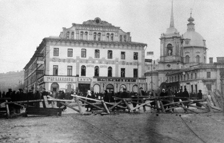 Здесь, прямо у стен храма, на площади и на Большой Никитской улице шли наиболее ожесточенные бои между большевиками и юнкерами, верными Временному правительству. В сражениях принимали участие и воспитанники Александровского военного училища; здание на соседней Знаменке, в котором оно располагалось, еще называли «Дом Апраксиных» по имени первых владельцев. Ныне в здании находится Генштаб Вооруженных сил России.