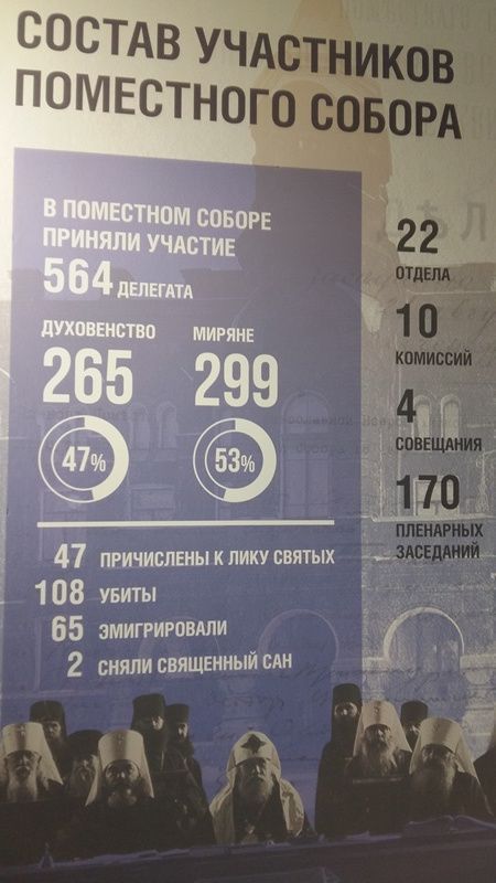 Кадры кинохроники о Патриархе Тихоне; кто-то из посетителей долго смотрит на них, по щекам текут слезы. 564 делегата, из них 53 процента – миряне; 108 убиты, 47 причислены к лику святых, 65 эмигрировали, два сняли священный сан.