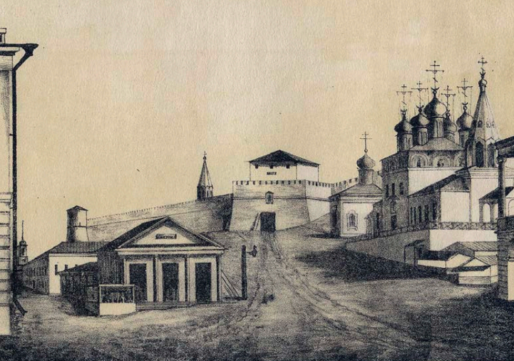 Привлекательность вида разглядел уже Дмитрий Быстрицкий (1816–?), которому нижегородцы обязаны целой серией работ, показывающих облик города в 1850‑е годы. Например, в 1911 году семнадцать его карандашных и акварельных рисунков, «исполненных способом камеры-обскуры», показывались на организованной Василием Бреевым Мининской выставке¹. К сожалению, сейчас об их местонахождении ничего не известно. Однако 25 ценнейших рисунков Быстрицкого дошли до нас в виде литографий из книги Николая Храмцовского «Краткий очерк истории и описание Нижнего Новгорода, в двух томах» (1857–1859). В ней и представлено самое старое из известных нам изображений Нижнего базара.