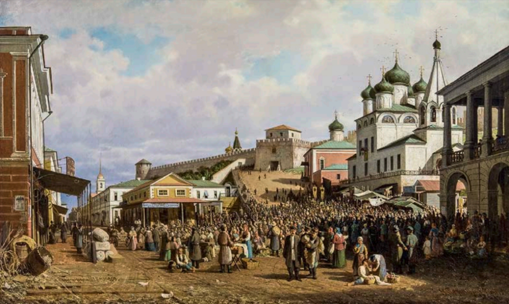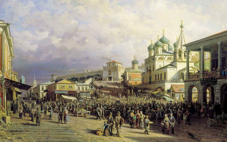 Однофамилец известного в будущем художника-баталиста, Верещагин окончил Академию художеств в Санкт-Петербурге и неоднократно изображал Нижний Новгород. Вы можете встретить информацию, что именно за нижегородский пейзаж 1867 года Верещагин получил звание художника², но это не совсем верно, потому что классным художником третьей степени он стал уже по окончании Академии. А вот звание художника второй степени, как следующий шаг в карьере, было получено им в 1867 году сразу за три картины, среди которых одна названная «Рынок в Новгороде»³. Если у Быстрицкого Нижний базар безлюден, то Верещагин охотно показывает жизнь рыночной площади. Он искусно изображает здесь каждую мелочь, вплоть до лежащих на земле соломинок.