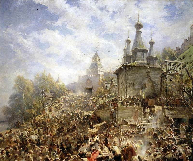 Мы порой даже не задумываемся, как творческий гений одного человека может повлиять на восприятие того или иного события либо исторического деятеля. Например, на Бориса Годунова мы глядим глазами Пушкина, а если заходит речь о первом русском царе, в памяти, прежде всего, всплывает художественный образ Иоанна Васильевича, держащего в объятьях безжизненное тело своего сына. Это произошло и с таким историческим событием, как воззвание Кузьмы Минина к нижегородцам, когда он предложил людям отдать все, что имеют, на создание и снабжение ополчения для освобождения Москвы и первым показал пример такого самоотречения. Константин Маковский в своей знаменитой картине показывает людей, внимающих Минину у стен Нижегородского кремля пред храмом Рождества Иоанна Предтечи, чей праздник мы отмечаем 7 июля. Почему именно это место выбрал художник для своей работы, и что мы знаем о том, как оно выглядело в прежние времена, рассказывает искусствовед Антон Марцев.