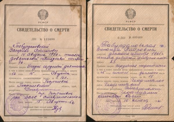 Свидетельства о смерти отца Валериана и матушки Зинаиды