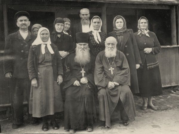Сидят: архимандрит Исавр (Стрелков) и протоиерей Валериан Тобурдановский