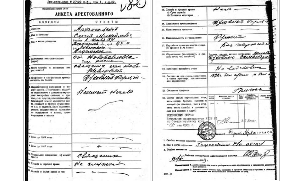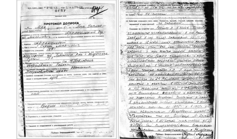 Елена Никифоровна Зубкова смогла найти в архивах составленные 75 лет назад протокол допроса и анкету ее арестованного деда. Эти документы, справка о реабилитации и, конечно же, рассказ самой Елены Никифоровны являются ярким свидетельством жизненного подвига протоиерея Сергия Архангельского.