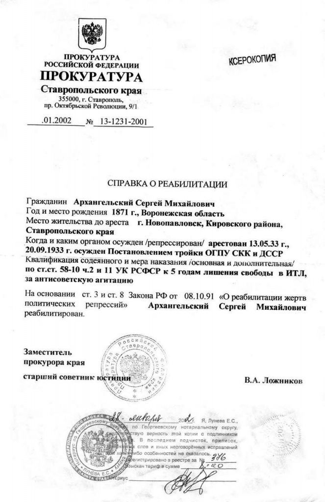 Священник Сергей Михайлович Архангельский реабилитирован посмертно на основании ст. 3 и ст. 8 Закона Российской Федерации «О реабилитации жертв политических репрессий».
