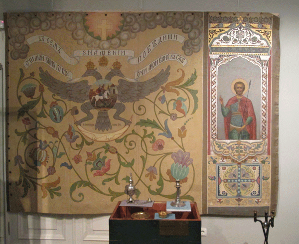 Смысловым центром выставки является жемчужина музейного собрания – походная церковь Собственного Его Императорского Величества сводного пехотного полка, созданная в конце XIX – начале XX века. Там же можно увидеть часть походного иконостаса, который был написан на прорезиненном брезенте и растягивался внутри палатки, детали облачения военного священника и церковную утварь, в том числе подсвечник, изготовленный из штыков к знаменитым «берданкам» – винтовкам системы Бердана №2.