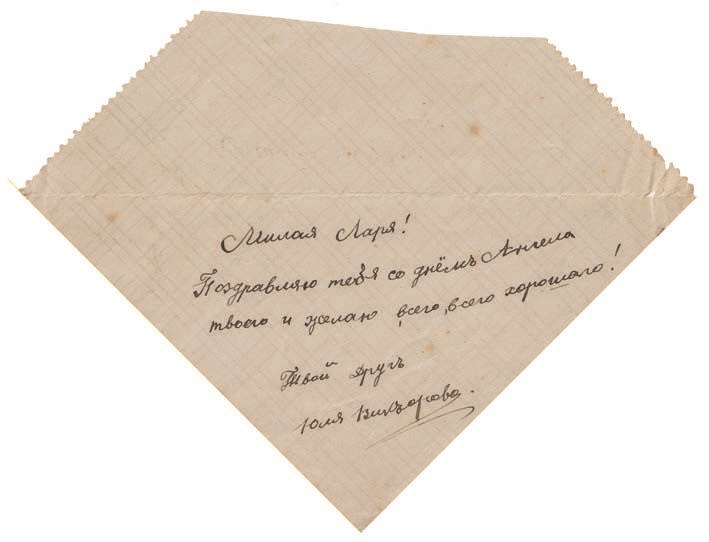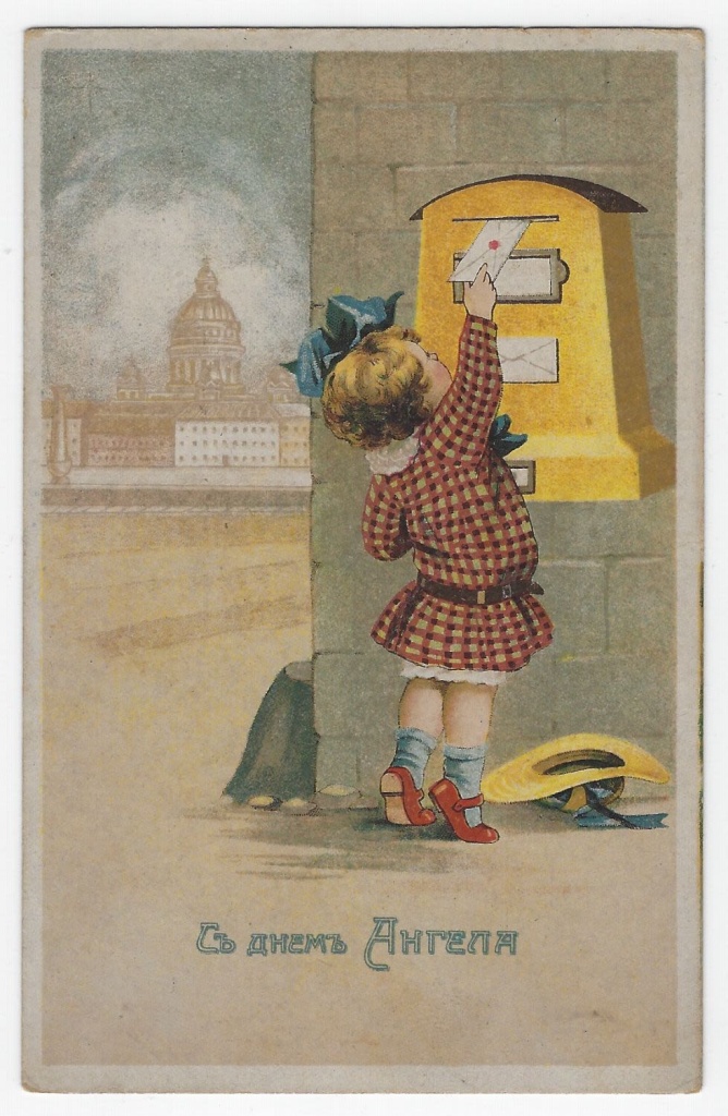 В начале прошлого века наиболее популярным вариантом поздравления с Днем Ангела стали почтовые открытки. Среди них можно было выбрать серии, издававшиеся благотворительными организациями, например, Общиной святой Евгении. Открытки полюбили, прежде всего, дети. Ученицы гимназий и институтов благородных девиц дарили их подругам и учителям. А вот для учащихся женских епархиальных училищ цены на открытки были дороги, поэтому подружке они чаще дарили записочку на листочке из маленького блокнота. Воспитанница Тамбовского епархиального училища Лариса Молчанова (в замужестве Шмелева) всю жизнь хранила такой подарок, полученный в 1903 году в возрасте десяти лет. Уголок со своей фамилией она аккуратно отрезала, так как в безбожное время были репрессированы и погибли отец и два брата, носившие эту фамилию.