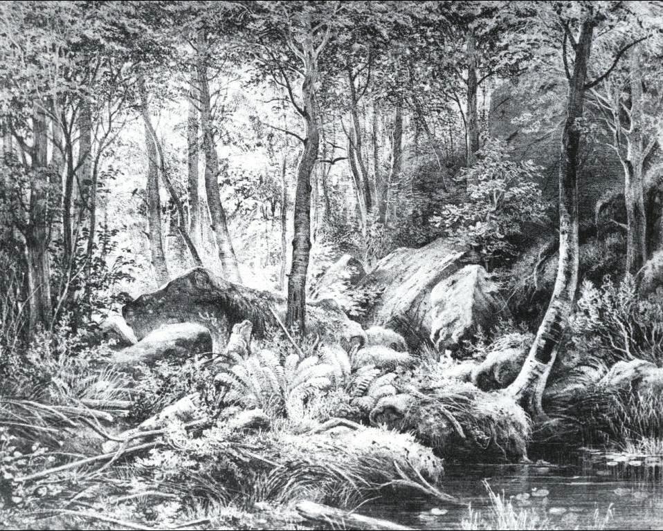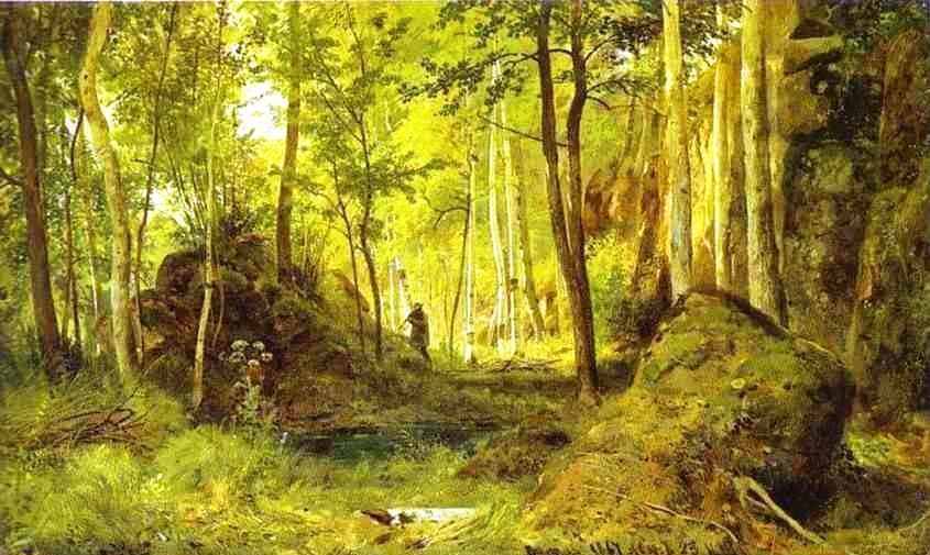 Несколько столетий назад И. Гете написал: «Природа – единственная книга, все страницы которой полны глубокого содержания». И.И. Шишкин с большой любовью всматривается в каждую деталь этой книги. Даже камни, поросшие мхом и папоротником, становятся объектом восторгов талантливой кисти художника. Тщательно прописана каждая травинка, каждый листик, каждая ветка на дереве. Влажностью дышит мшистый покров, и кажется, что именно здесь, в глубине леса, в солнечной истоме летнего дня зарождается таинственный дух природы, первооснова её существования, чувствуется подпитывающая её изнутри некая неведомая сила, и этот малый микрокосм предстает перед зрителем в во всем великолепии своего существования.
