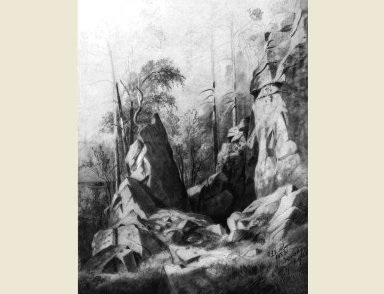 Из всех видов живописи И.И. Шишкин более всего любил пейзаж. На Валааме художник работал с необычайным творческим подъемом, несмотря на частые ненастья. «Погода здесь стоит прегадкая, ветра и дожди страшные. Вчера повалило несколько деревьев на наших глазах. Особенно жаль два огромных клена, верно, лет по полтораста, тоже сломало, …потому что стояли на огромной скале, над садом. И мы теперь шляемся под дождем и под ветром, ходим смотреть волны – да, действительно, я еще до сих пор ничего подобного не видывал, даже и вообразить-то не мог. Страх что такое. Хлещут в скалы вверх сажень на восемь… Есть где разгуляться… Несмотря на весь ужас их действия, мы смотрим на них с величайшим удовольствием. Не знаю, как завтра пойдет пароход из Петербурга, нынче их два, стал недавно ходить новый пароход «Валаам» Сердобольский и частью монастырской компании. Славный пароход, но качки боится и, вероятно, тоже будет трусить, а монахи молодцы, им все нипочем. Сегодня из Сердоболя приехал отец игумен, и ничего, только, говорит, покачало порядочно».
