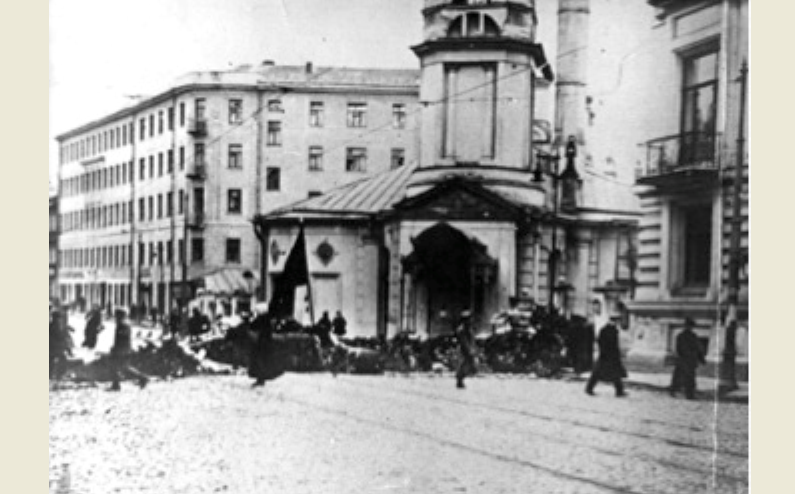 Осенью 1917 года Зачатьевский монастырь ощутил на себе первые «отзвуки» революционного переворота. В самом начале ноября за стенами обители гремели ожесточенные бои: «Красногвардейцы и революционные солдаты продвигались сюда на штурм белогвардейского штаба Московского военного округа во Всеволожском переулке: от Зачатьевского монастыря, отбитого у белых, и от Крымской площади по Остоженке. Юнкера превратили “дом с голубятней” (№ 13) и дом № 10 по Остоженке в мощные пункты сопротивления. На башне монастыря и колокольне церкви, стоявшей на месте нынешнего углового сквера, революционеры установили огневые точки», − рассказывает Ю. Федосюк («Лучи от Кремля»). Если говорить точнее, на колокольне приписной Воскресенской церкви был размещен бомбомет.
