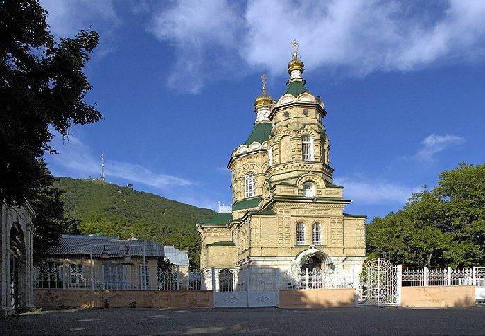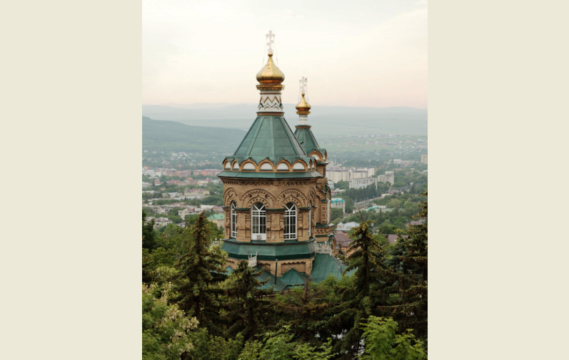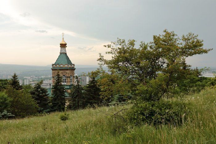 Более века высятся золотые маковки Лазаревского храма на фоне желто-зеленых склонов горы Машук. Особенно хорош храм в октябре, когда осень одевает деревья в изысканные наряды. Золотистые березы, яркие листья кленов, зеленые ветви сосен и елей гармонично оттеняют старинное здание, выполненное из желтого кирпича в традиционном русском стиле – с узорчатыми сводами и шатровыми куполами, устремленными ввысь, в небо.